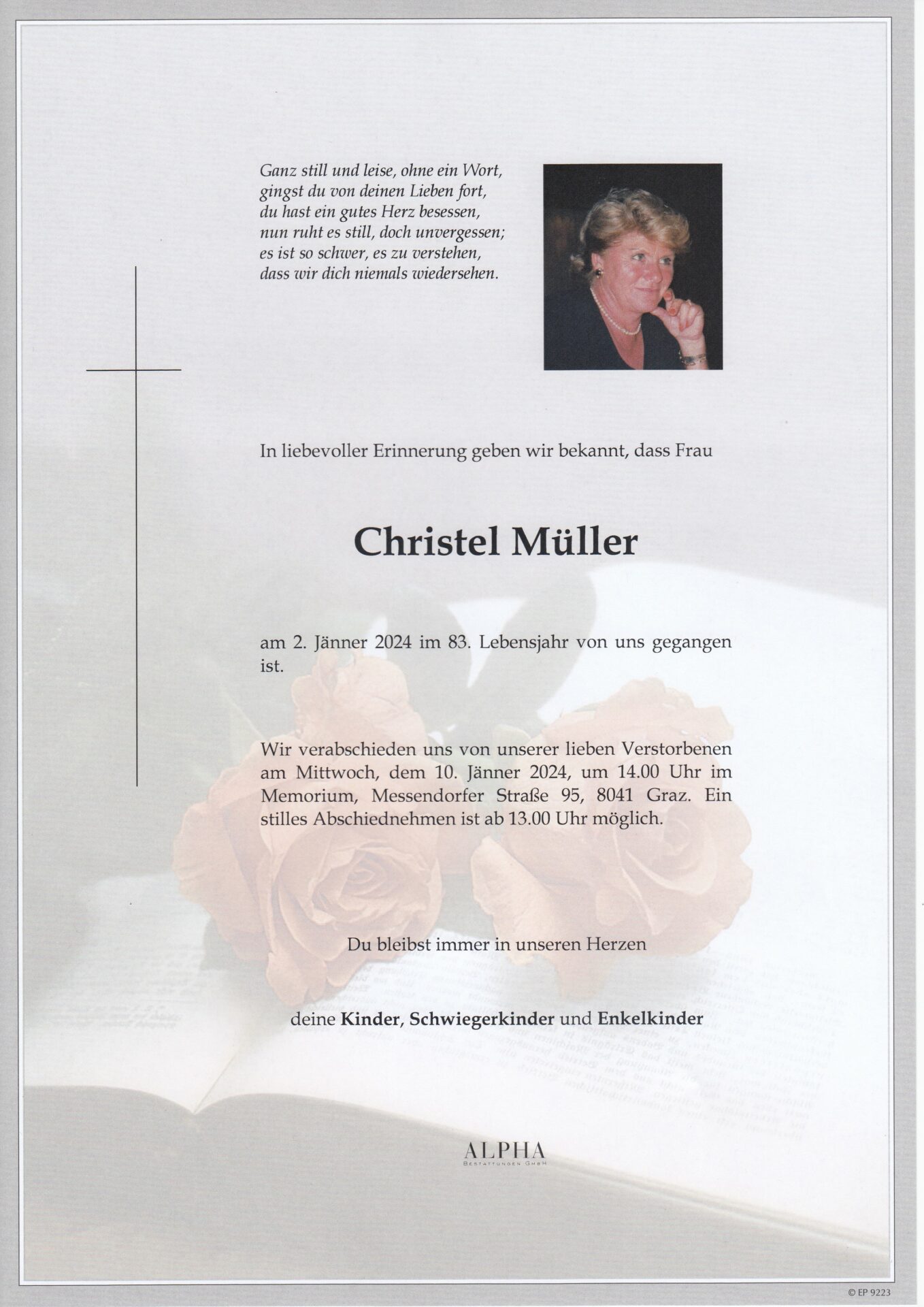 Mit dem Tod eines geliebten Menschen verliert man vieles, niemals aber die gemeinsame Zeit. Es war mir eine Freude, dich gekannt zu haben, liebe Christel! Meine Anteilnahme gilt deinen Söhnen. Anneli