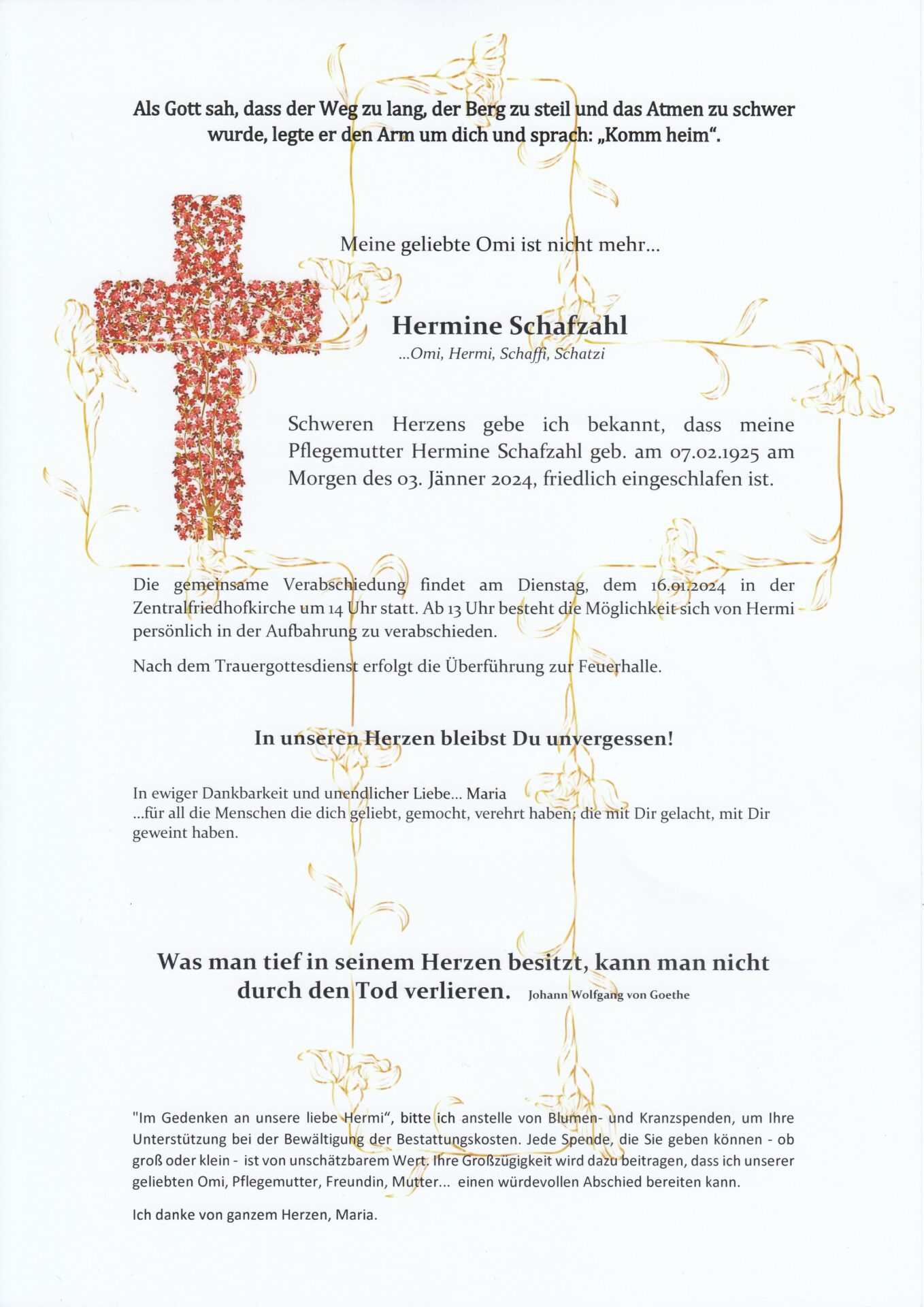 Am Dienstag, dem 16. Jänner 2024 um 14:00 Uhr in der Kirche am Zentralfriedhof in Graz