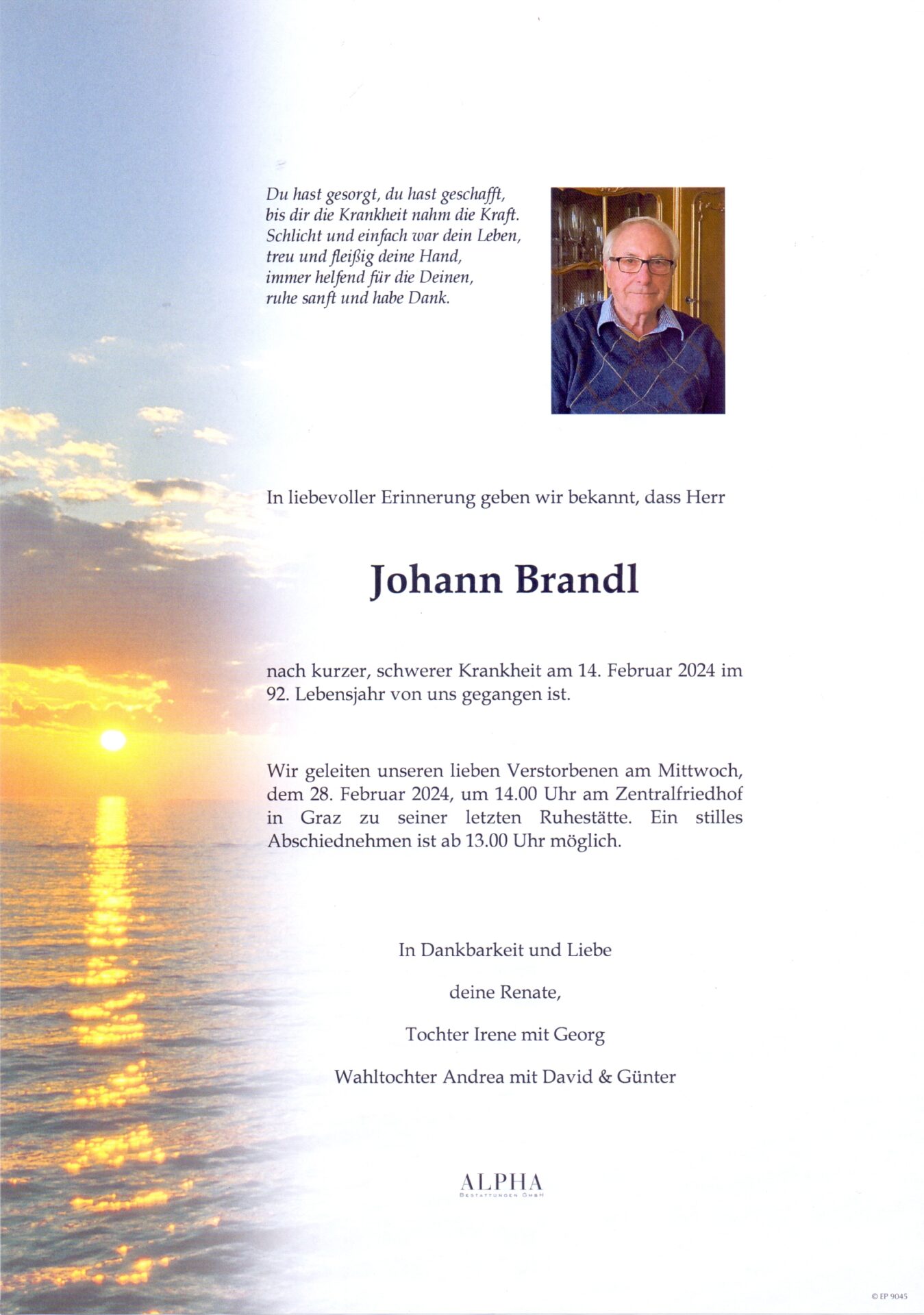 Herzlichstes Beileid. In stiller Dankbarkeit Engelbert Dreisiebner