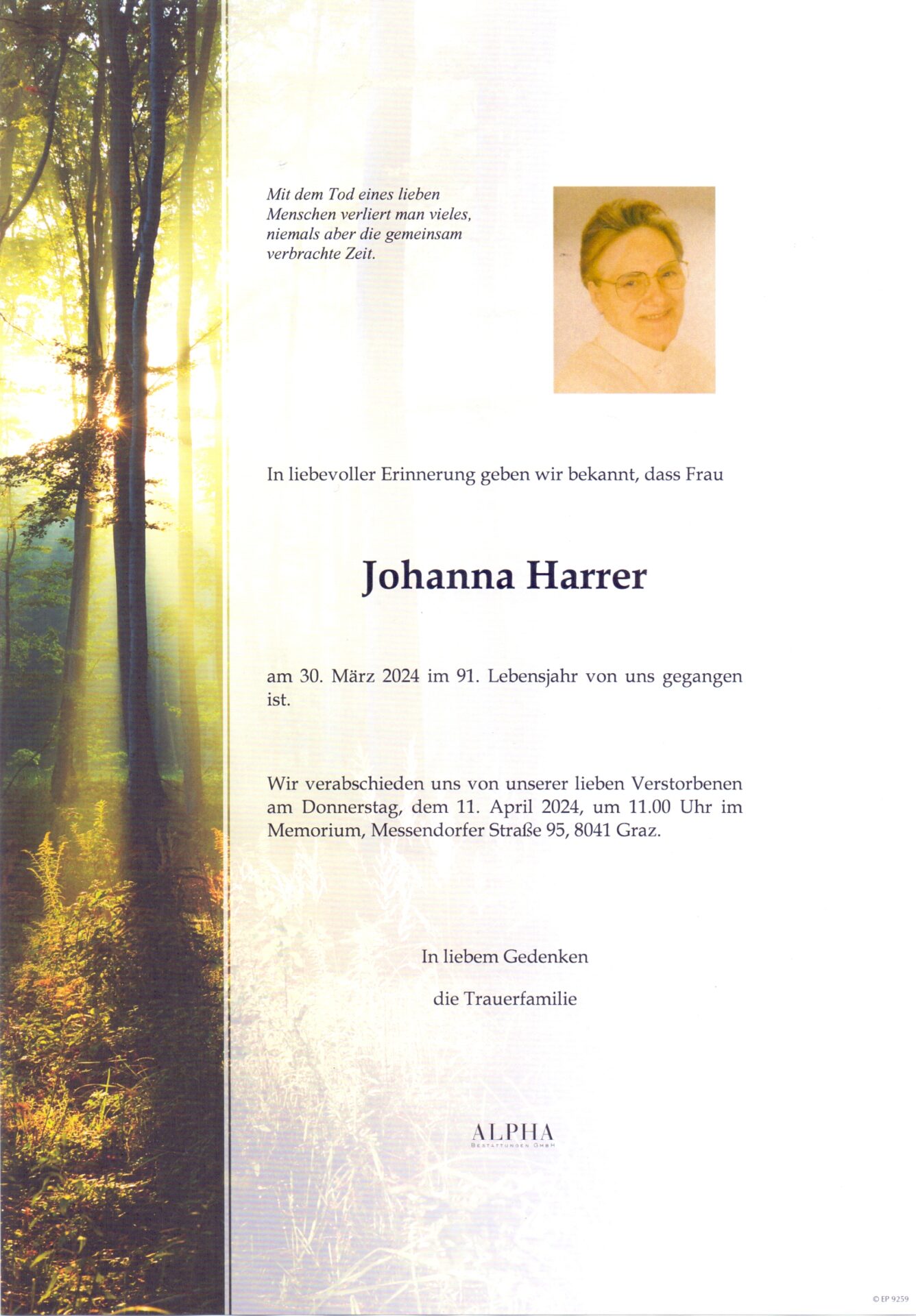 Die Verabschiedung findet am Donnerstag, dem 11. April um 11.00 Uhr im Memorium, Messendorfer Straße 95, 8041 Graz, statt.
