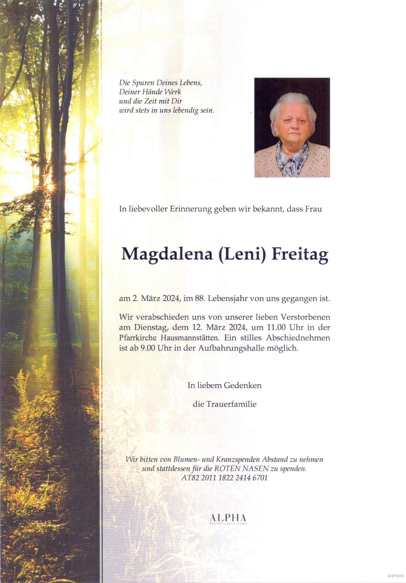 Die Verabschiedung findet am Dienstag, dem 12. Februar um 11.00 Uhr in der Pfarrkirche Hausmannstätten statt.