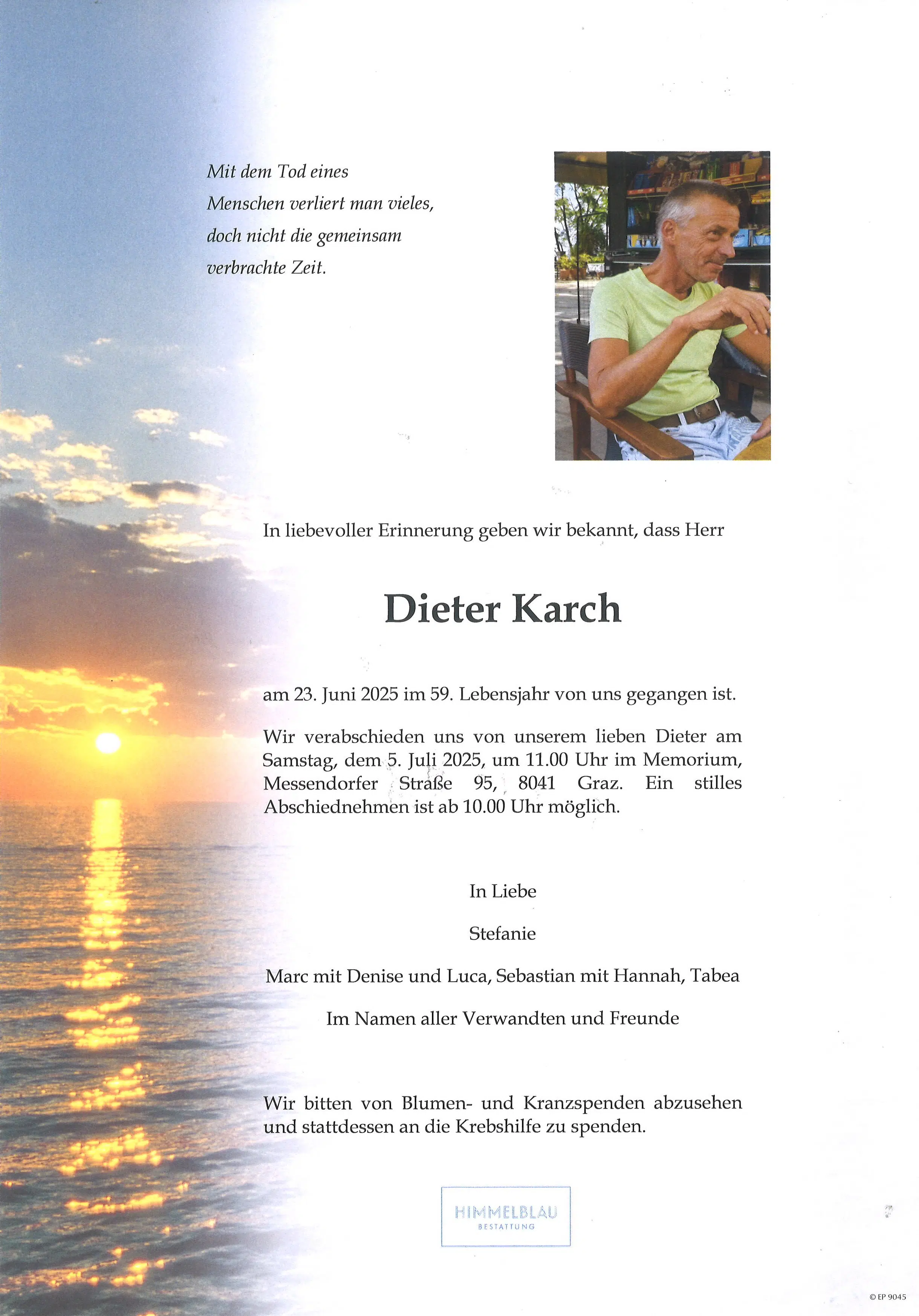 Wir verabschieden uns von unserem lieben Dieter am Samstag, dem 5. Juli 2025, um 11.00 Uhr im Memorium, Messendorfer Straße 95, 8041 Graz. Ein stilles Abschiednehmen ist ab 10.00 Uhr möglich.