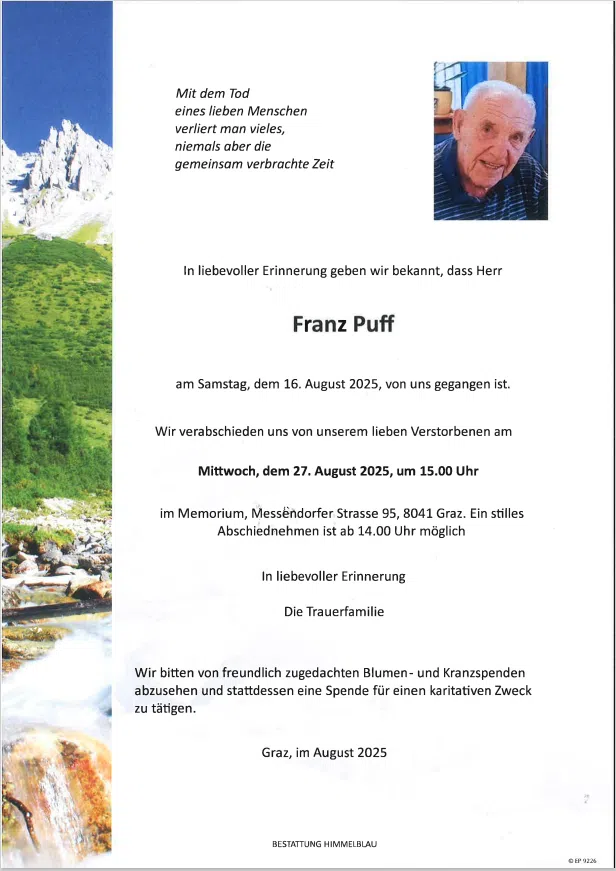 Wir verabschieden uns von unserem lieben Verstorbenen am Mittwoch, dem 27.August 2025, um 15.00 Uhr im Memorium, Messendorfer Strasse 95, 8041 Graz. Ein stilles Abschiednehmen ist ab 14.00 Uhr möglich.