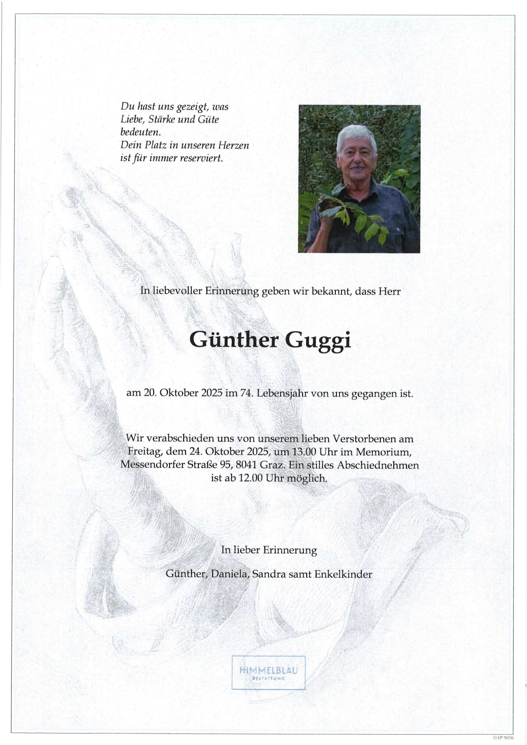 Wir verabschieden uns von unserem lieben Verstorbenen am Freitag, dem 24. Oktober 2025, um 13.00 Uhr im Memorium, Messendorfer Straße 95, 8041 Graz. Ein stilles Abschiednehmen ist ab 12.00 Uhr möglich.