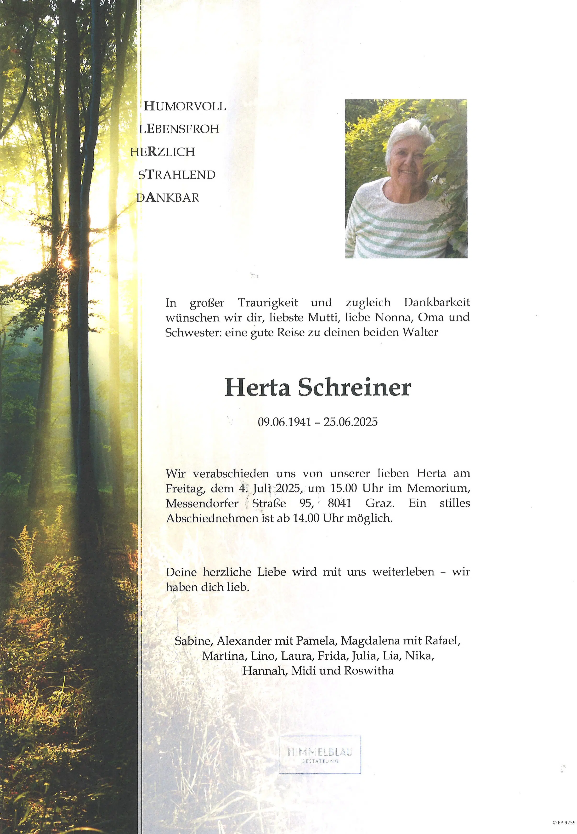 Wir verabschieden uns von unserer lieben Herta am Freitag, dem 4. Juli 2025, um 15.00 Uhr im Memorium, Messendorfer Straße 95, 8041 Graz. Ein stilles Abschiednehmen ist ab 14.00 Uhr möglich.