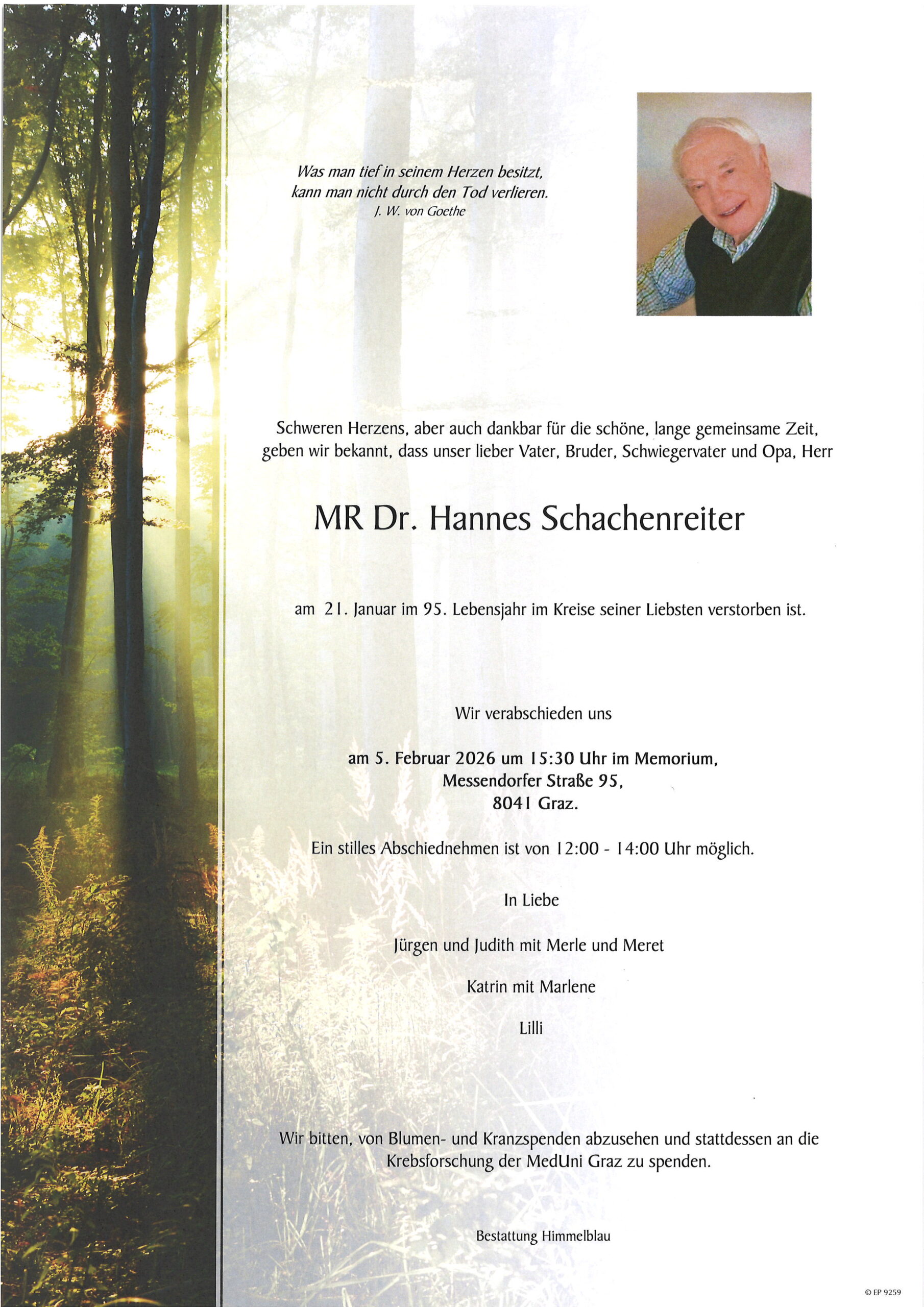 Wir verabschieden uns am 5. Februar 2026 um 15:30 Uhr im Memorium, Messendorfer Straße 95, 8041 Graz. Ein stilles Abschiednehmen ist von 12:00 – 14:00 Uhr möglich.