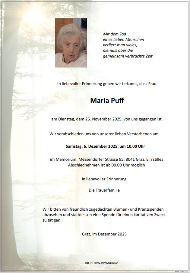 Die Verabschiedung findet am Samstag, dem 06. Dezember 2025 um 10.00 Uhr im Memorium, Messendorfer Straße 95, 8041 Graz, statt.