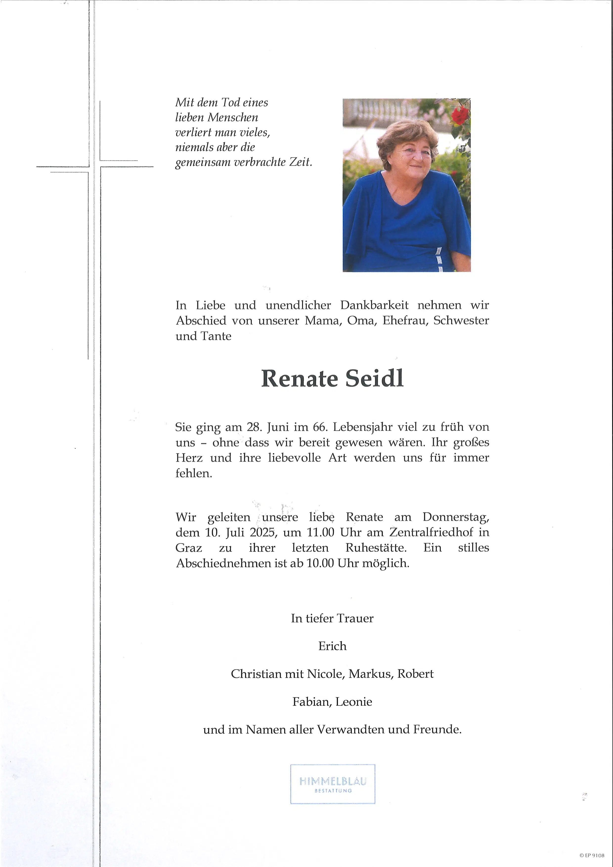 Wir geleiten unsere liebe Renate am Donnerstag, dem 10. Juli 2025, um 11.00 Uhr am Zentralfriedhof in Graz zu ihrer letzten Ruhestätte. Ein stilles Abschiednehmen ist ab 10.00 Uhr möglich.
