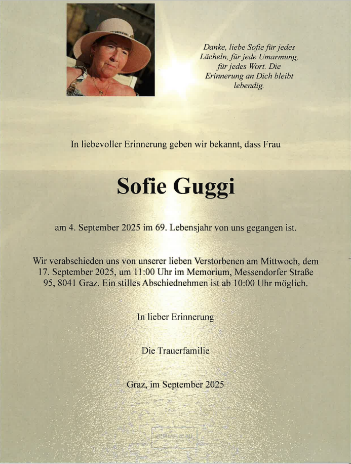Wir verabschieden uns von unserer lieben Verstorbenen am Mittwoch, dem 17. September 2025, um 11.00 Uhr im Memorium, Messendorfer Strasse 95, 8041 Graz. Ein stilles Abschiednehmen ist ab 10.00 Uhr möglich.
